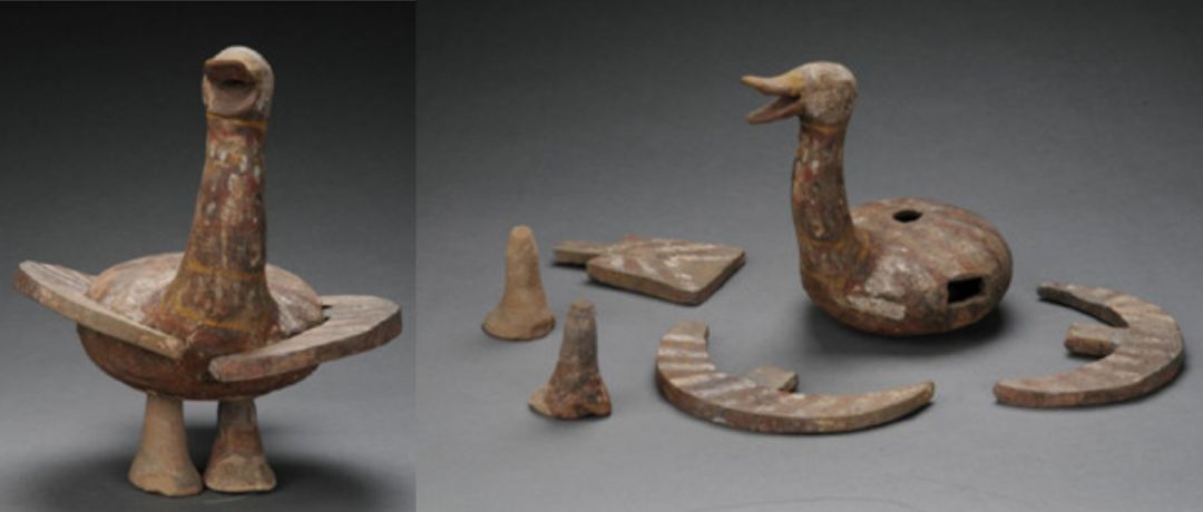 郑州二里岗的战国墓葬群出土了两件彩绘陶鸭,现藏河南博物院。整件器物的创作不仅运用了彩绘的手法,也借鉴了青铜器分铸和拼接的方法。图片:河南博物院