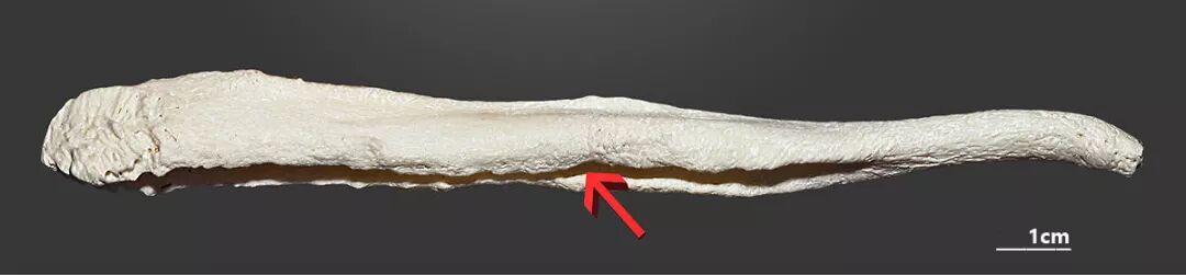食肉目犬科的比利牛斯山犬(亦称大白熊犬)的阴茎骨,箭头所指位置为尿道沟。图片:Didier Descouens / museum.toulouse.fr