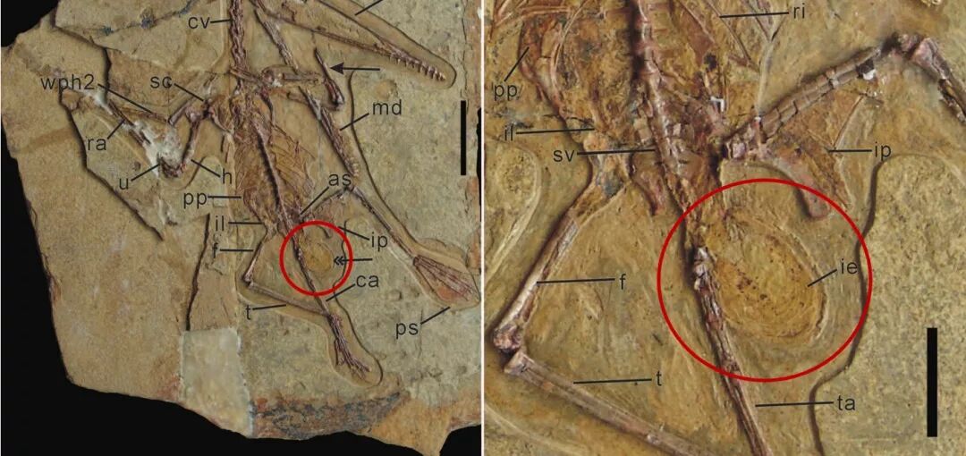 达尔文翼龙化石,红色圆圈中所示的结构为一颗化石蛋。图片:Junchang Lü et.al. / Science (2011)