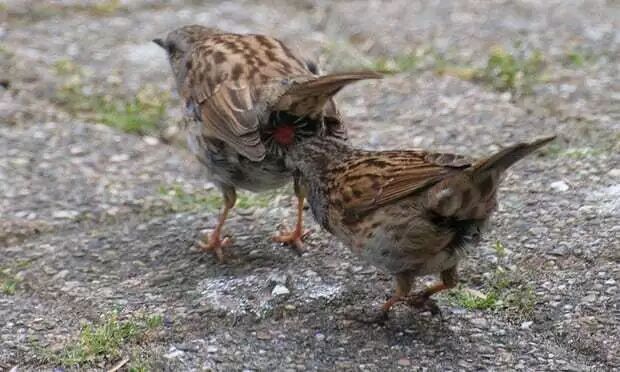 所有鸟类都由近鸟型恐龙演化而来。鸟类也有泄殖腔,除了用于排遗、生产之外,亦是交配时器官的接合处。图为交配前探查泄殖腔的林岩鹨[liù](Prunella modularis)。图片:Arend Vermazeren / flickr