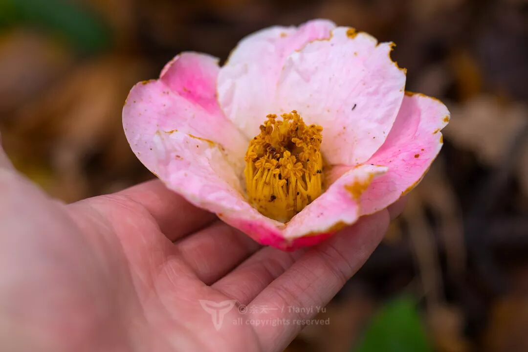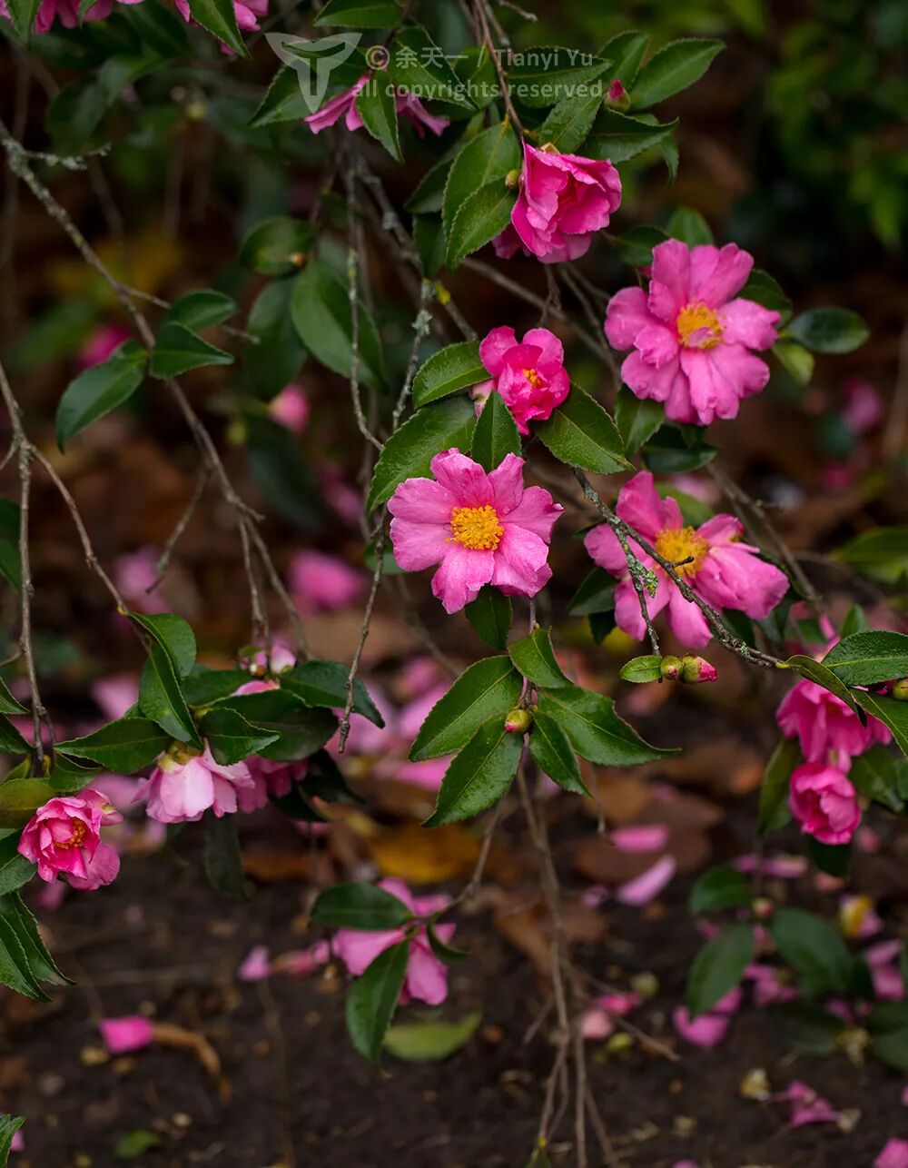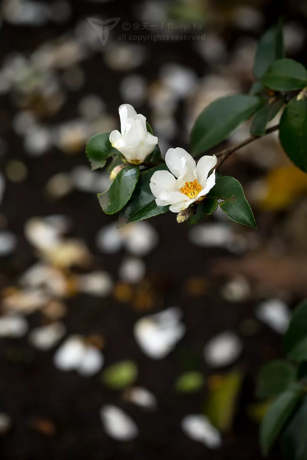 茶梅和落瓣短柱茶的杂交种(Camellia sasanqua × kissii),可以看到零落的花瓣。