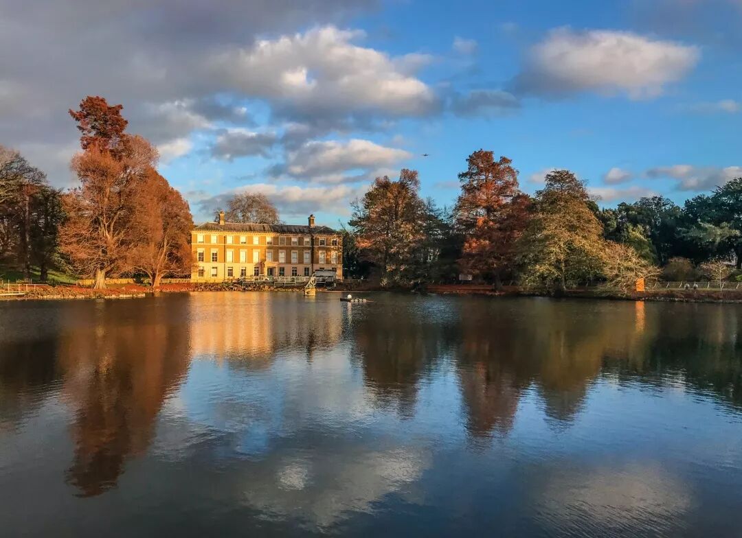 邱园湖景,灌木是各色的红瑞木品种,冬季落叶后可以观赏枝条,大乔木就是落羽杉。