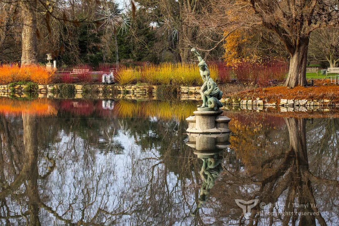 伦敦的落叶阔叶树这个时候已经凋零得差不多了,只留下遒劲而繁复的枝条。落羽杉正如其名,是一种秋季会落叶的针叶树,此时也褪下了羽毛一般棕红色的霓裳,静静等待冬天的到来。