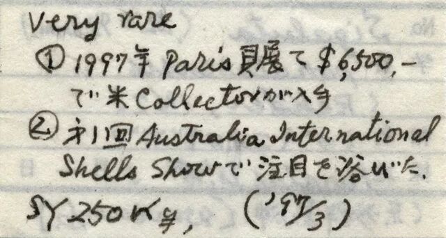 21年前,已故著名日本贝壳收藏家伊藤宏先生购买了一颗海螺标本。这颗标本不算太大,最长处“仅”93.5毫米,还不及一听可乐高;但是从伊藤先生亲笔书写的标签来看,它可不便宜。