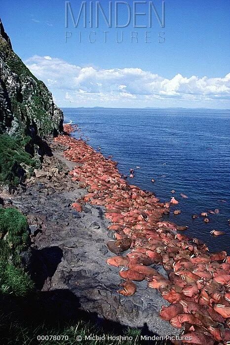 海象们挤在狭窄的海滩上,“象”生艰难。 图片:Michio Hoshino / Minden Pictures