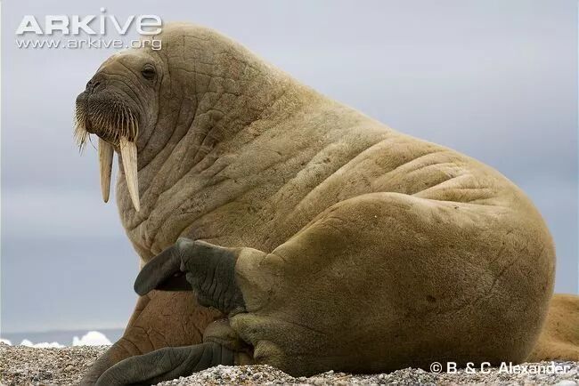 通过这样高效敏捷的进食方式,一头成年海象仅一天就可以吃掉2000只蛤蜊。高频使用使得晶须被泥沙不断摩擦折断,因此野生海象的胡须长度往往远短于被圈养的同类们。