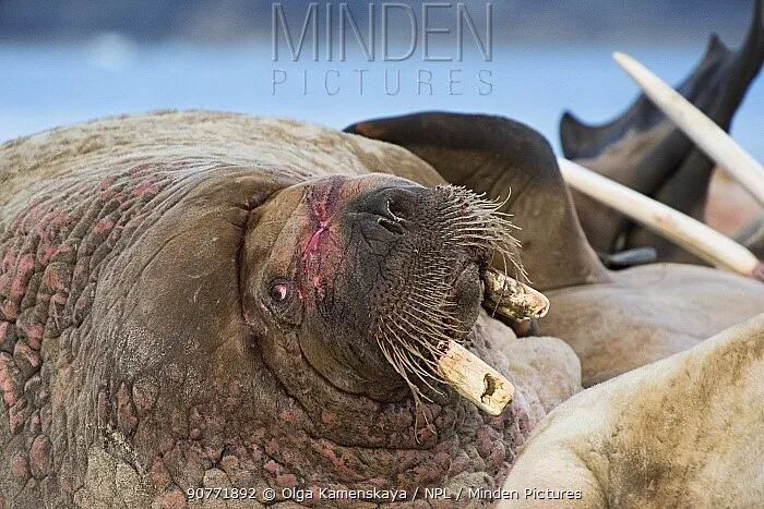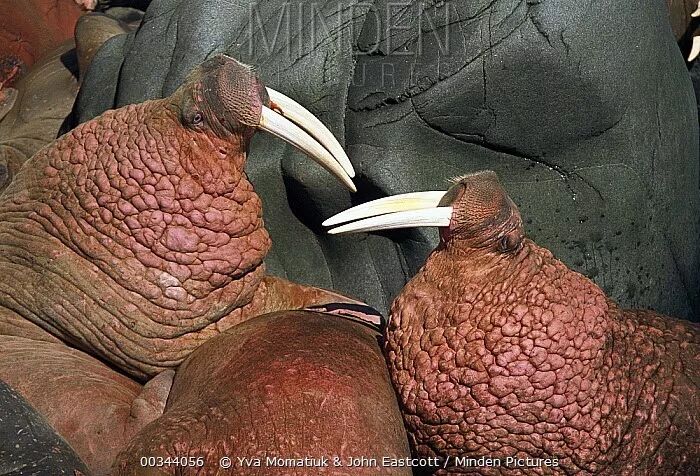 实际上,除了在交配季节争夺配偶权时,或者在寸土寸金的浮冰或浅滩上竞争一块歇脚场地之外,海象们很少将长牙用作武器。即便是雄性之间的争夺,长牙的作用也是很有限的——海象的皮肤厚实坚韧,而老年海象一米多长的牙齿又很容易折断。