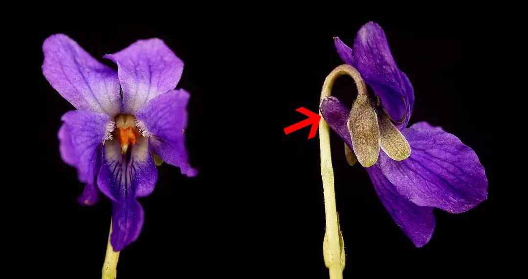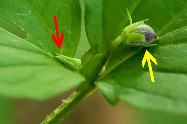与香堇菜同属的V. pubescens,红箭头所指为闭锁花,黄箭头所指为果实。图片:bobklips.com