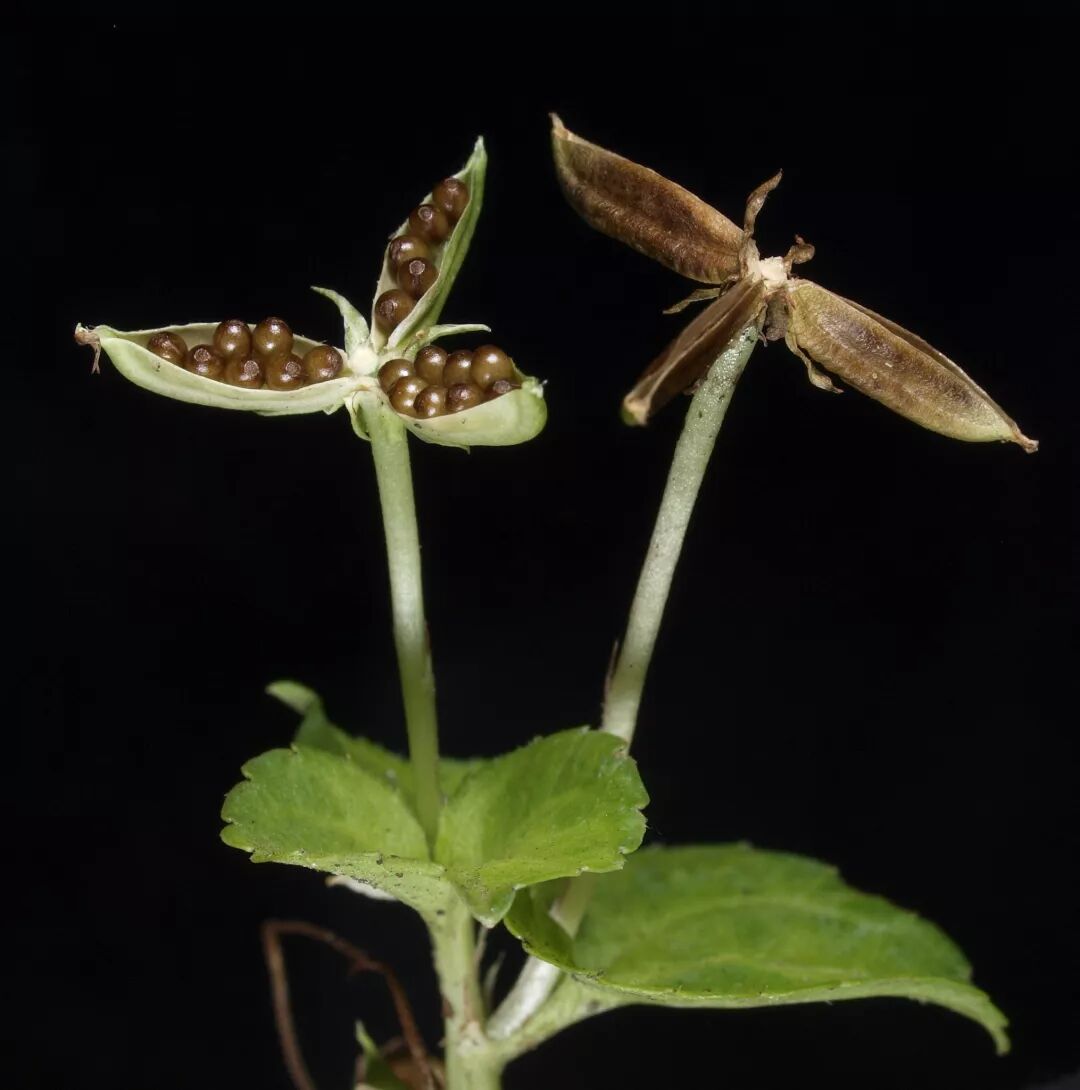 在种子传播的策略上,香堇菜也是非常有智慧的。它们的果实为蒴果,有3个心皮,成熟后会分裂成三瓣;果瓣呈舟状,有厚而硬的龙骨,当薄的部分干燥、收缩时,果瓣会向外弯曲,并将种子弹射出去。