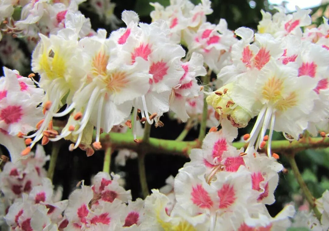 欧洲七叶树的花期是每年四月中旬至五月初,硕大的圆锥花序像雪白的宝塔一样生长在枝条最顶端,醒目而壮观。欧洲七叶树的花比中国的七叶树更大,花瓣基部的色斑也更明显;共同点是两者的色斑都会随时间变化而由黄变橙最后变红,黄红相间非常绚丽。
