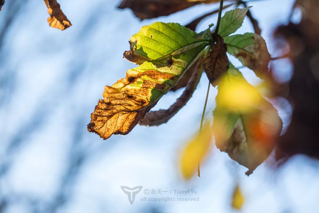 叶片受到欧洲七叶树潜叶蛾的侵害,形成明显的病斑。图片:余天一