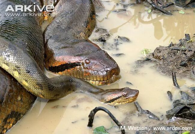与网纹蟒争夺世界最大现生蛇类这一称号的最有力竞争者是分布于南美洲的绿水蚺(Eunectes murinus)。绿水蚺又被称作森蚺,是著名恐怖电影《狂蟒之灾》的原形,曾有人报道称见过长度10米以上的个体,但未能提供可靠依据。目前最可靠的最大全长记录为5.6米,这个数字无疑让众多“挺蚺派”大为失望。