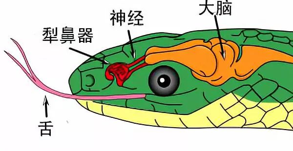 不光是网纹蟒,所有蛇和蜥蜴都会通过吐信子的方式感知外界,不过它们的舌表面没有味蕾,无法产生味觉,真正用于感受“气味”的器官隐藏在口腔上方——名叫犁鼻器的化学感受器。犁鼻器是一对深色的盲囊,位于腭前部靠近鼻腔的地方,其表面满布嗅觉上皮,以嗅神经与端脑相连,并有一在腭上开口的短导管与口腔相通。当分叉的舌尖不断伸出口外摆动时,空气中飘浮的微粒即黏附或溶解于舌上。紧接着,当舌缩回口中的时候,舌尖将化学微粒送入犁鼻器在口腔的开口,从而产生嗅觉。犁鼻器最早出现于两栖动物中,在哺乳动物(包括人)的胚胎期也普遍存在,不过只有爬行类将它的功能发挥到了极致。