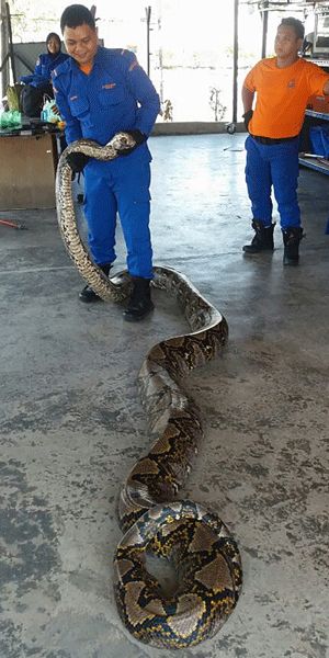 马来西亚民防部队成员在吉隆坡郊外一个建筑工地的一棵树旁发现的网纹蟒,长约7.5米。图片:AFP