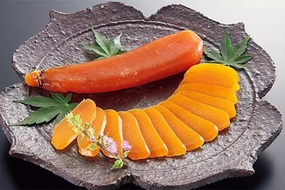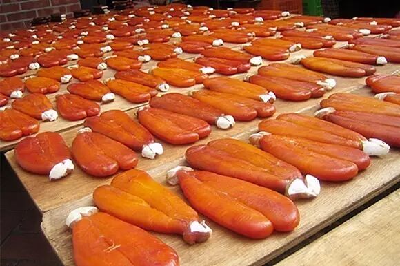 渔民将繁殖期捕获的雌鲻鱼开肚取卵,漂洗干净后用食盐腌渍去腥,经过压制脱水干燥后便得到了高大上的经典食材“乌鱼子“。