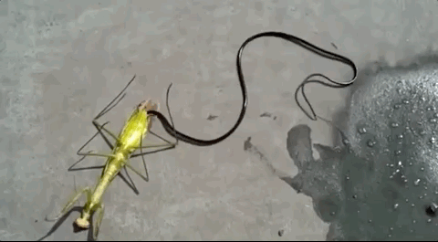 铁线虫正在离开螳螂身体,刚看完《毒液》的朋友,这个动作眼熟不?图片:imgur