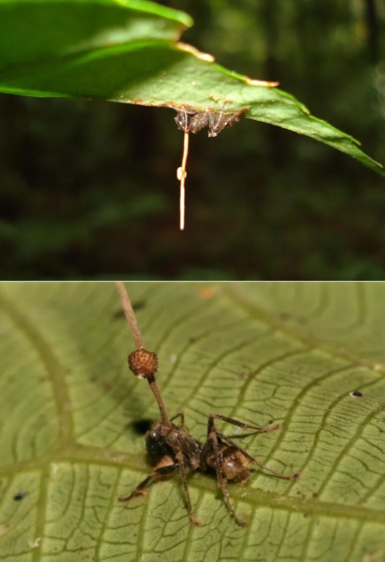 这些真菌寄生蚂蚁后,会操纵蚂蚁爬上植物,找到适合真菌传播的位置,对着叶脉或茎咬下去。如此一来,蚂蚁死后就会牢牢固定在原地,而啃咬叶片造成的伤口也让真菌得以侵入植物,进一步生长。