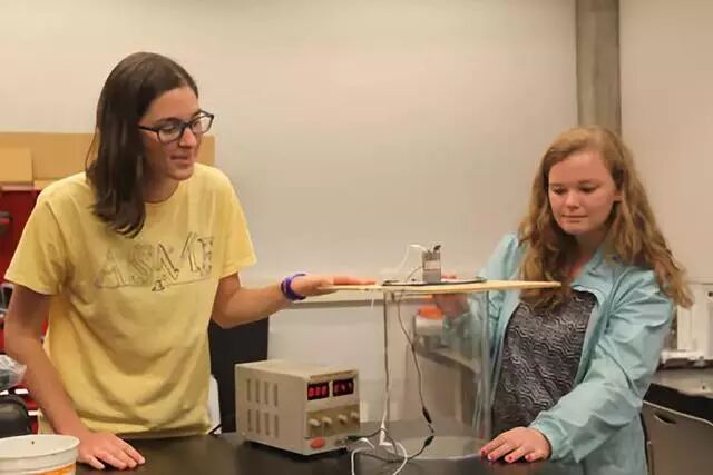胡立德的学生玛格丽特和凯西正在测试“哺乳动物尾部模拟器”。图片:胡立德