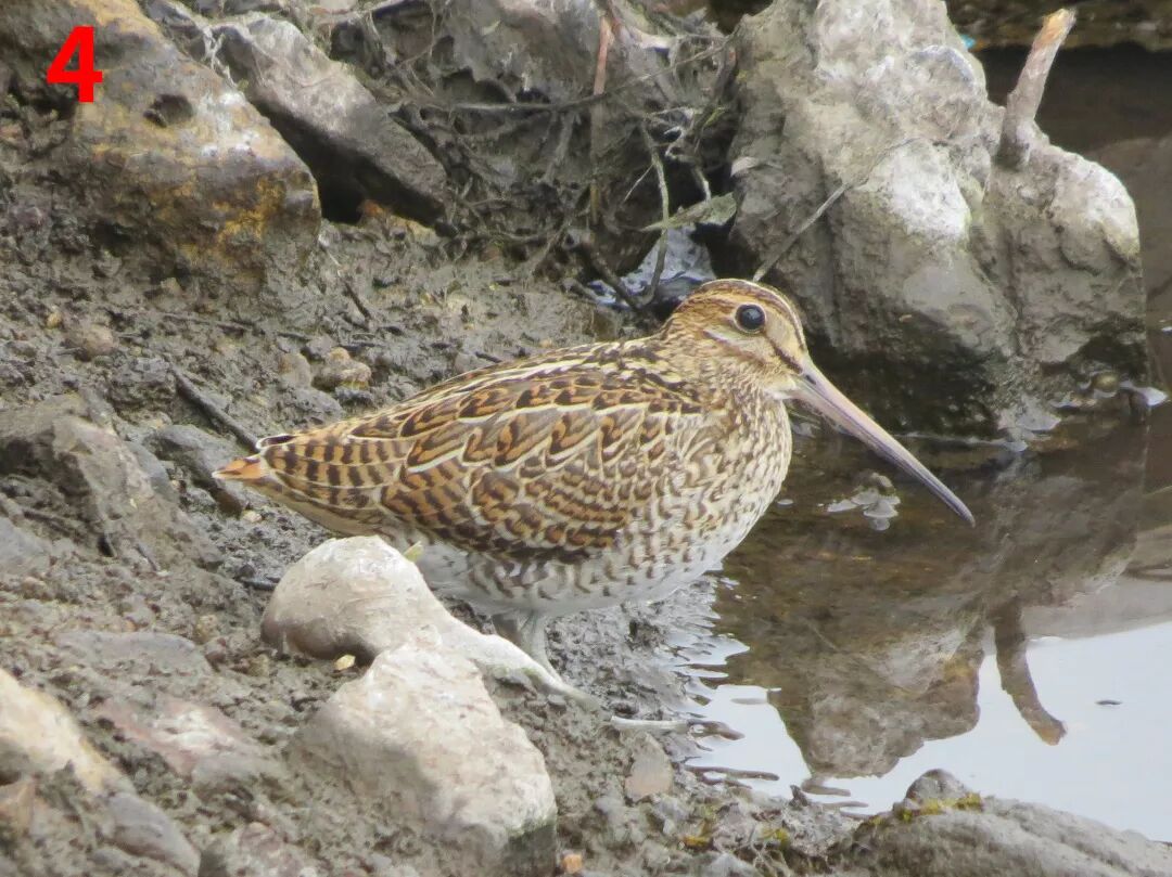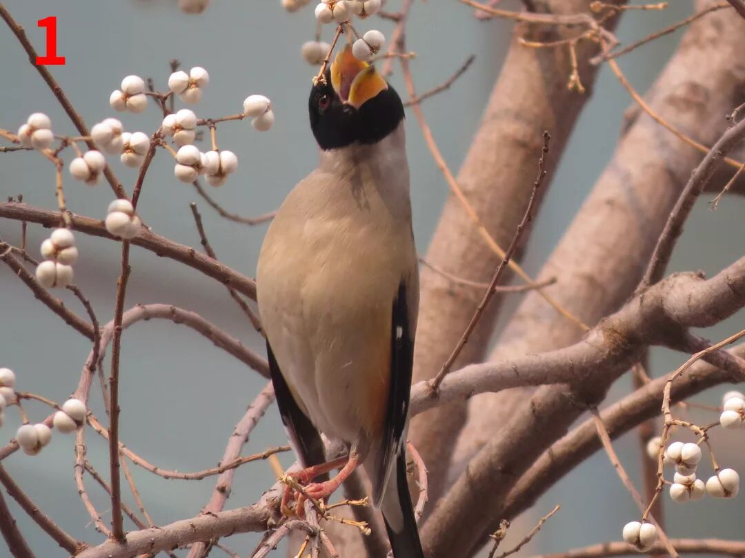 1:正在吃乌桕树籽的黑尾蜡嘴雀;2:黄喉鹀喜欢在地面上寻找食物;3:在大学校园里越冬的红胁蓝尾鸲;4:针尾沙锥会在城市湿地公园的水边停歇。图片:南川木菠萝