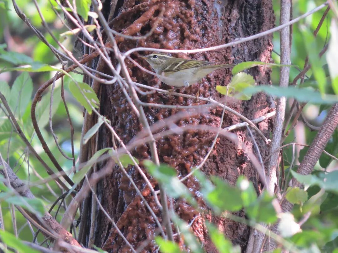 2016年10月记录到一只柳莺(可能是黄眉柳莺或黄腰柳莺),正在吸食公园患病树木流出的汁液。图片:南川木菠萝