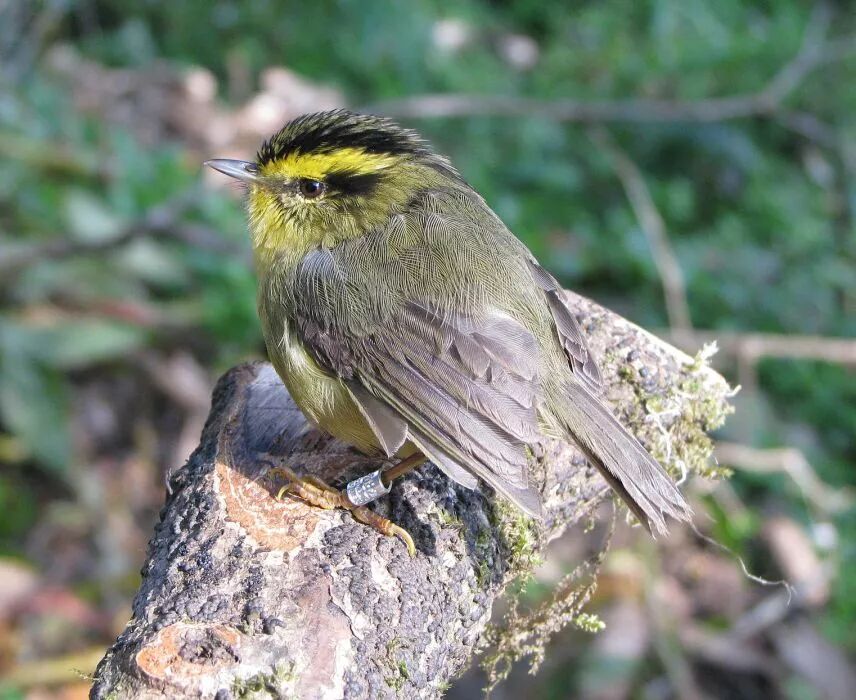 人们将野生鸟类捕捉后戴上有唯一编号的标记物,并放归野外,用以记录分析迁移路线、种群数量、死亡率、领地状况等信息,这就是环志。这只黄喉雀鹛[méi]的左脚上就有一枚带编号的金属脚环。图片:Umeshsrinivasan / wikimedia