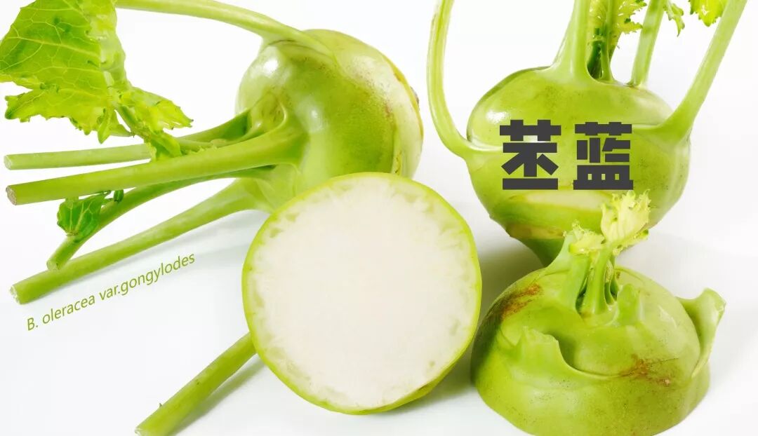 想象一下我们往芥蓝的茎里吹气,让它的茎鼓成一个圆球形,我们就得到了苤[piě]蓝。苤蓝和之前提到过的芜菁的区别在于,苤蓝的叶柄是从球状体的中部长出来的,这说明这个膨大的部分是它的茎而不是根。