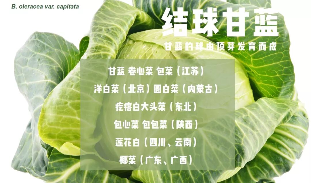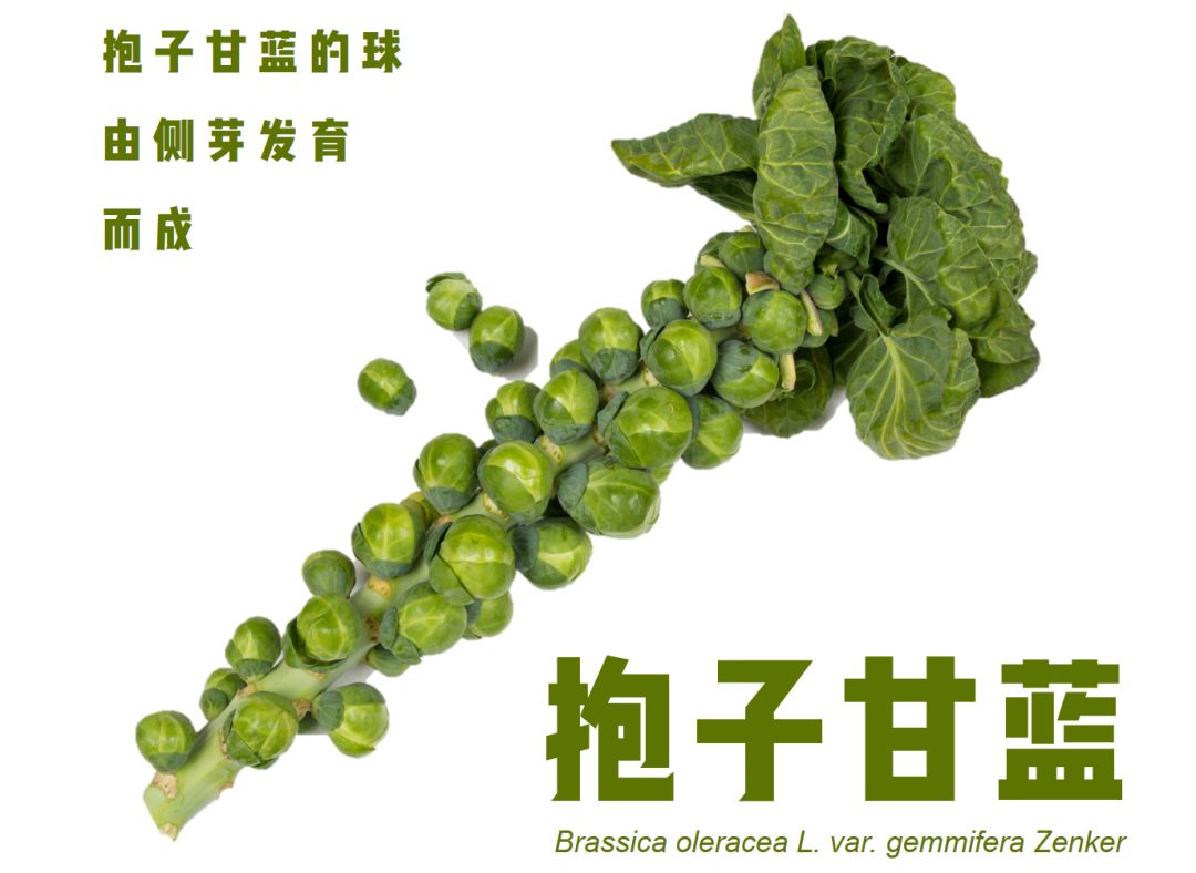 结球甘蓝在各地也有着各种不同的名字:卷心菜、包菜、莲花白、大头菜等等。结球甘蓝的“大头”是由顶芽发育而来,还有一种蔬菜的球状体是由腋芽发育而来,它就是抱子甘蓝。抱子甘蓝在西餐中出现较多,但抱子甘蓝生吃味道较冲,因此一般不用做沙拉,而是经过烤制之后食用。