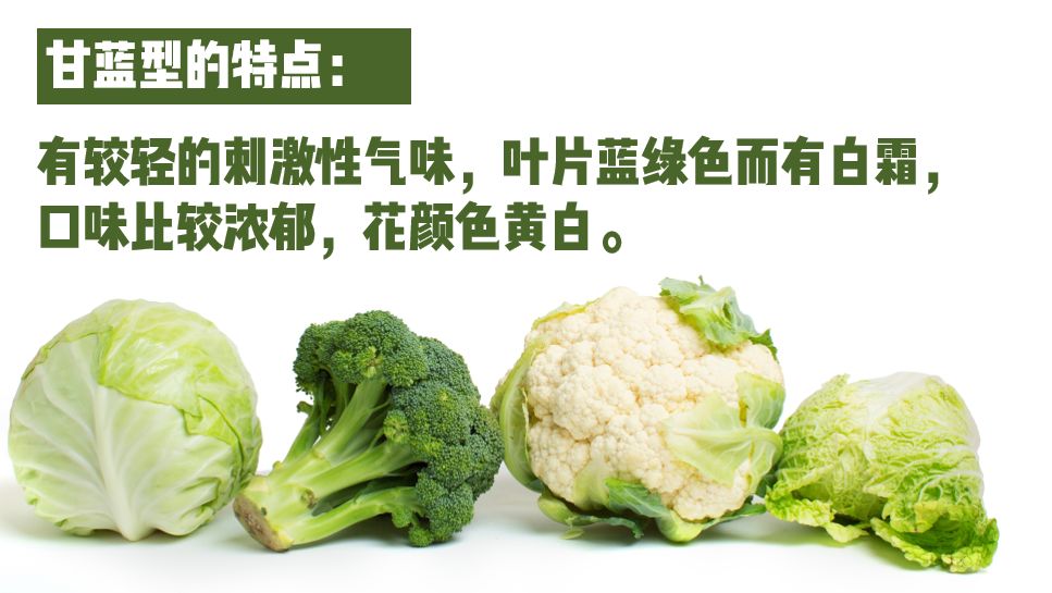 芸薹属蔬菜的第二个类型是甘蓝型。甘蓝型的蔬菜有较轻的刺激性气味,叶片蓝绿色而有白霜,口味比较浓郁,花黄白色。
