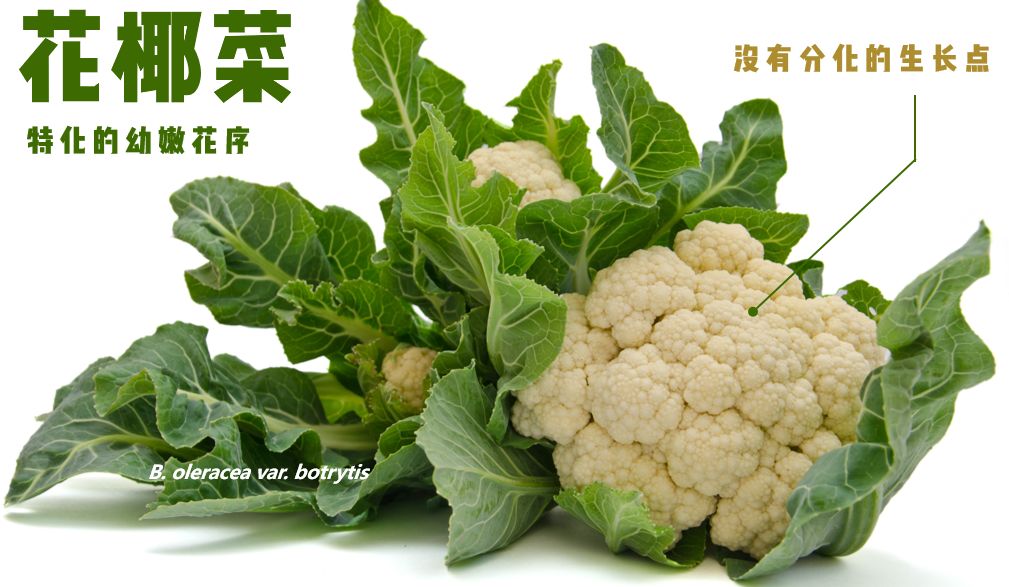 花椰菜也是甘蓝型的蔬菜,只不过之前提到的蔬菜的球状体都是有叶片构成,而花菜的球状体是没有发育的花序。如果等花菜长大之后,它的花序会散开来并且从中抽出菜薹,最后在顶端开花。