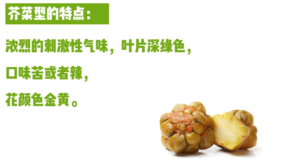 芸薹属蔬菜的最后一个类型是芥菜型。芥菜型的蔬菜一般不能直接食用,因为它们通常有着强烈的刺激性气味,吃起来要么太苦要么太辣,一般都经过腌制之后食用。