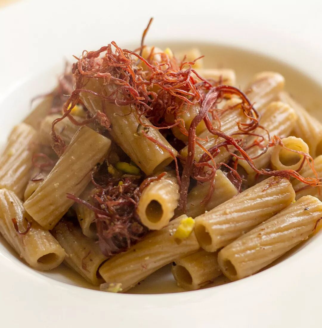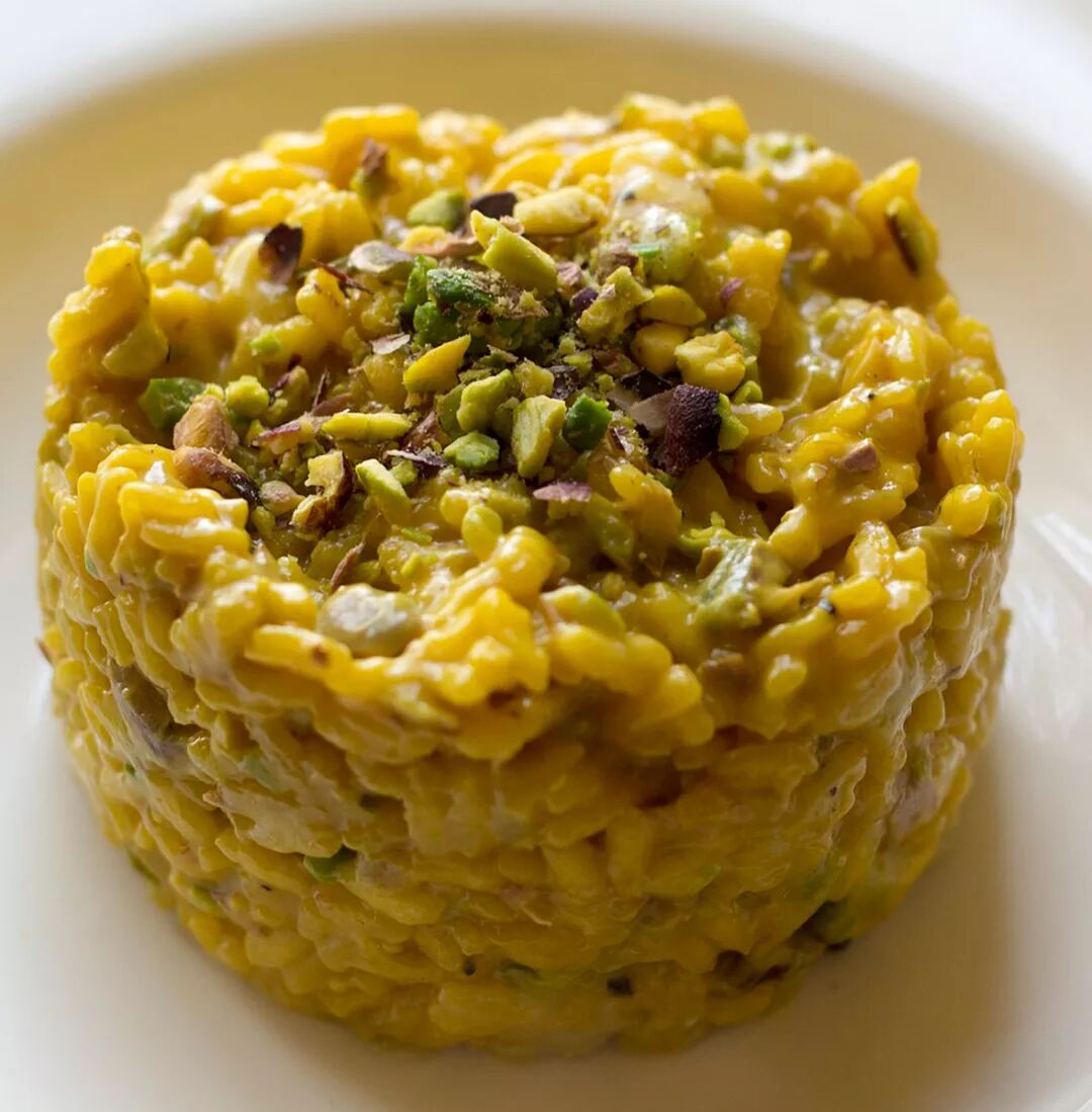 花式吃法:开心果冰淇淋,含开心果和肉桂粉的淀粉糊,意式开心果烩饭,烟熏马腿肉配开心果意面。图片:Tiia Monto & Maor X / wikimedia;Luca Nebuloni / Flickr