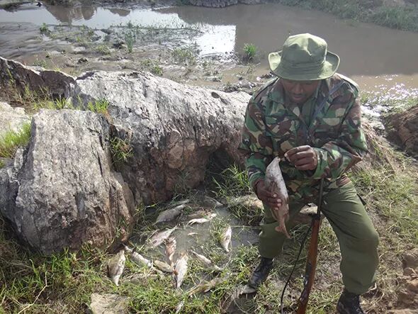 鹳、秃鹫、鳄鱼和鬣狗会迅速把死鱼解决掉,因此如果你没有亲眼目睹死鱼的出现,根本不会知道鱼正在死亡。当地的护林员知道这个现象,但他们将原因归结于农民在上游的田地里喷洒杀虫剂。