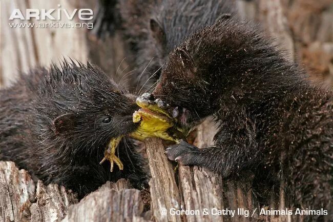 虽然是鼬的近亲又长得像貂,但在陆上行走时,美洲水貂和水獭们有些像,是一蹦一蹦、“前仰后合”地往前窜;进到水里之后,也会“如獭得水”,只要温度不太低,能在水中游动好几个小时,潜水捉鱼也不在话下。美洲水貂和自己的鼬属亲戚一样是可怕的杀手,鱼、蛙、虾蟹、小型哺乳类、水禽样样不落,食谱可谓是海陆空三栖,因地制宜。不光如此,面对比自己大的捕食者,美洲水貂也敢于正面反击,气场强大。