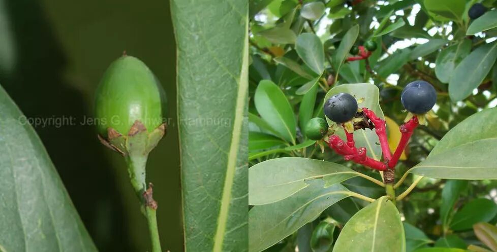 左:楠属白楠(Phoebe neurantha),其花被片紧贴果实;右:润楠属红楠(Machilus thunbergii)的果实,其花被片反卷。图片:Jens G. Rohwer / myspecies.info;alchetron.com