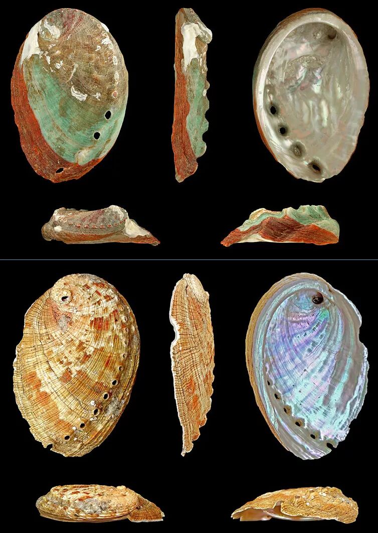 上:皱纹盘鲍的贝壳;下:杂色鲍的贝壳。图片:H. Zell / Wikimedia