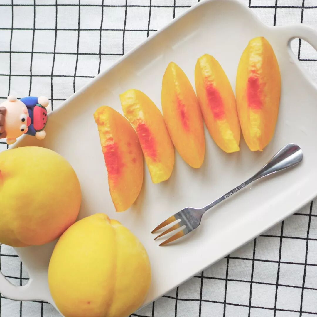 桃子作为水果经过了人类几千年的培育,出现了不同颜色的品种,花青素多的就是红肉桃,积累了大量类胡萝卜素就是黄肉桃,那些花青素和类胡萝卜素都不多的就是白桃。但这些色素在桃子中也并不是水火不容的,比如高山黄桃的果肉就是由黄色和红色两种颜色构成,越靠近核的地方越红,可味道却不打折扣,靠近核的地方一样有滋有味,越深入了解越惹人喜爱,闺蜜聚会和发朋友圈都是极好的。