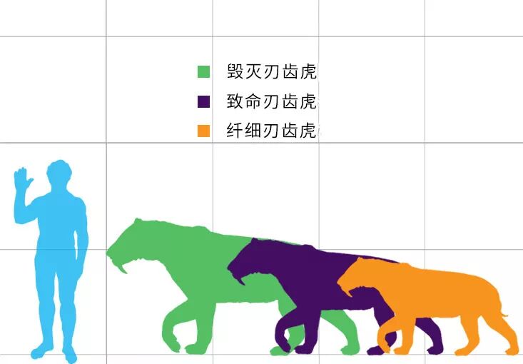 三种斯剑虎的体型对比,从大到小分别是毁灭刃齿虎、致命刃齿虎和纤细刃齿虎。图片:Matthew Martyniuk / wikimedia;汉化:物种日历