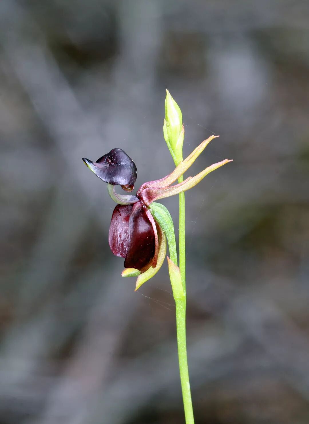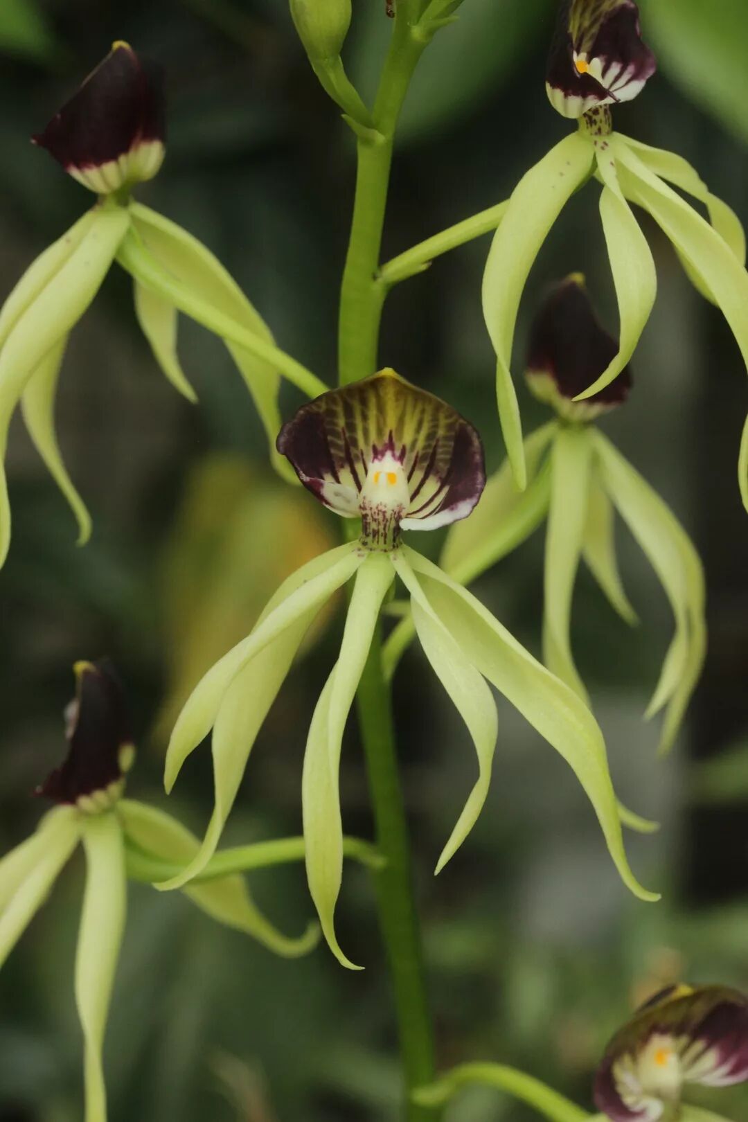 这是章鱼兰(Encyclia cochleata),分布于中美洲,两片花瓣与三片花萼外形类似,向下耷拉着,颇似章鱼的腕足,只有特化的唇瓣高高立起,组成章鱼的头部,吸引昆虫来落脚。