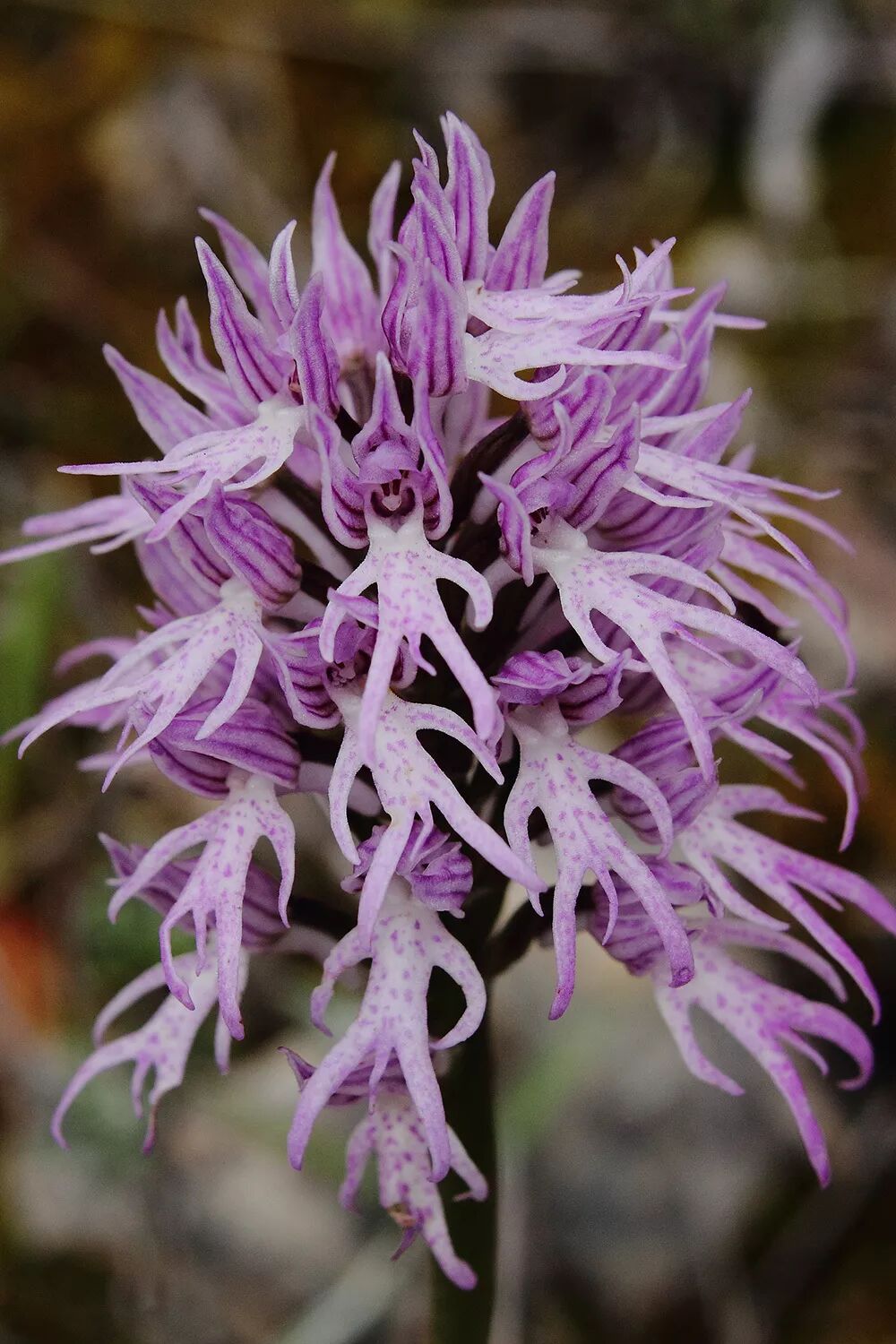 意大利红门兰(Orchis italica)生长在地中海沿岸,不要想多,整个奇怪的图形只是它们多裂的唇瓣。意大利红门兰也不提供花蜜,它们只是靠外形、颜色长得像其他产蜜的植物,比如说百里香、野豌豆它们,引得蜜蜂飞来传粉,然后空欢喜一场……