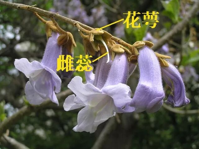 毛泡桐花冠钟型,裂片上二下三,内部有深紫色的斑点和作为蜜导的黄色斑块。