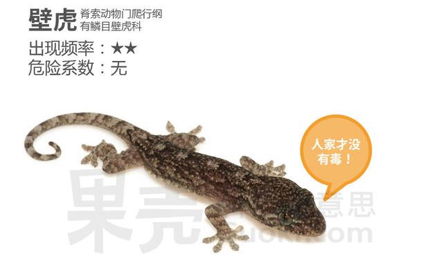 相比上面几位正儿八经的有毒家伙,壁虎被列入“五毒”纯粹是“躺枪”。在我国屋室内外常见的诸如无蹼壁虎(Gekko swinhonis)、多疣壁虎(G. japonicus)、蹼趾壁虎(G. subpalmatus)等都是无毒的。壁虎被古人们误认为是毒虫,大抵是因为惊异于它们大都昼伏夜出、能攀附在墙壁上寂静无声的爬行、受惊之后又会留下扭动着的尾巴等奇特本领罢了。当然,我们小的时候都听说过壁虎的尿会弄瞎人眼、壁虎的尾巴会钻进人耳把人搞聋等传说,但事实上都是不可能发生的。
