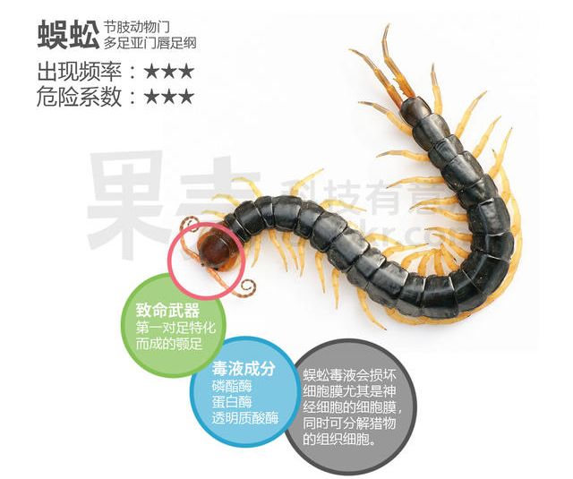 令蜈蚣荣登毒虫之列的是它第一躯干节的一对特化的足——颚足。蜈蚣的颚足尖锐有力,并且和毒腺相连。在蜈蚣捕食时,先出其不意地用前几对步足抱握住猎物,然后用颚足刺入猎物体内并注射毒液。蜈蚣的毒液主要包含多种酶类,如磷酯酶、蛋白酶、透明质酸酶等。其中磷脂酶被认为可以造成细胞膜,尤其是神经细胞膜的损伤;而蛋白酶和透明质酸酶则可分解猎物组织。