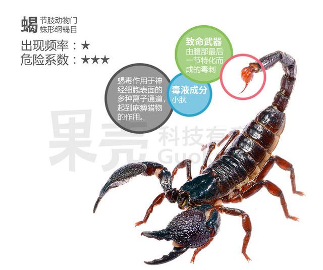 在我国西北部,蝎子,尤其是东亚钳蝎(Buthus martensi)算是比较常见的室内毒虫了。不过幸好它在钳蝎科(Buthidae)中算是毒力较弱的一位,被它蜇了大抵只是红肿疼痛而已。而它的亲戚们,例如以色列金蝎(Leiurus quinquestriatus)就不是那么好惹了,由于它喜爱躲藏在衣服褶皱或鞋子里,因此常有被严重蜇伤的事例,对于儿童或虚弱的人来说有可能致命。钳蝎科在蝎目中是有毒种类最多的一个科,大部分的有毒蝎类都属于这个科。而一些块头更大,看起来更凶悍的蝎子,如帝王蝎(Pandinus spp.),毒性则很弱,更多的依靠两个强而有力的螯来进行捕猎。对于蝎类来说,通常螯越发达,毒性越弱,反之则毒性越强。看来是偏向物理攻击还是化学攻击,也是需要考虑的呢。