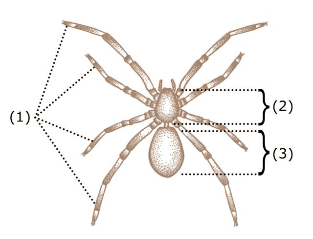 蛛形纲的基本身体结构:(1)足、(2)头胸部、(3)腹部。图片:wiki commons