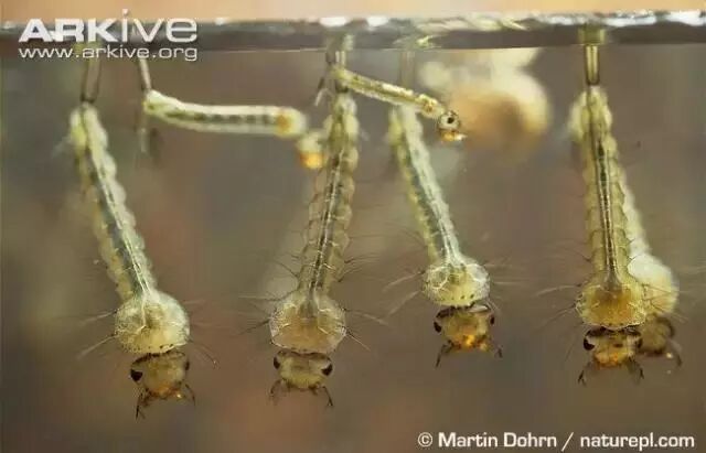 它们的幼虫也非常特别,其他蚊子的孑孓一般以垂直或倾斜的角度沉在水面下,只有呼吸管与水面相连;而按蚊的孑孓则整个懒洋洋地贴着水面躺着。