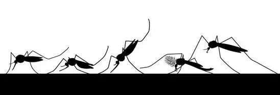 常见蚊子及其近亲的栖息姿态。从左到右:库蚊、伊蚊、按蚊、摇蚊、大蚊。绘图:深山虫吟