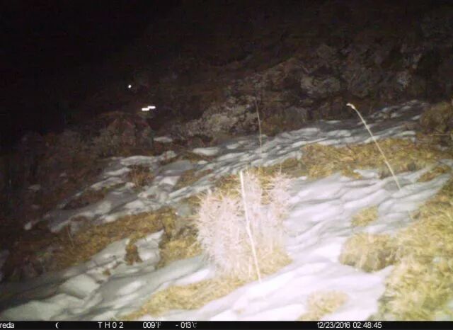 冰冰来到家羊面前,家羊在红圈内。注意冰冰的大尾巴,虽然红外相机夜间画质一般,但依旧能看清尾巴上的斑纹,以此确认冰冰的身份。图片:荒野新疆