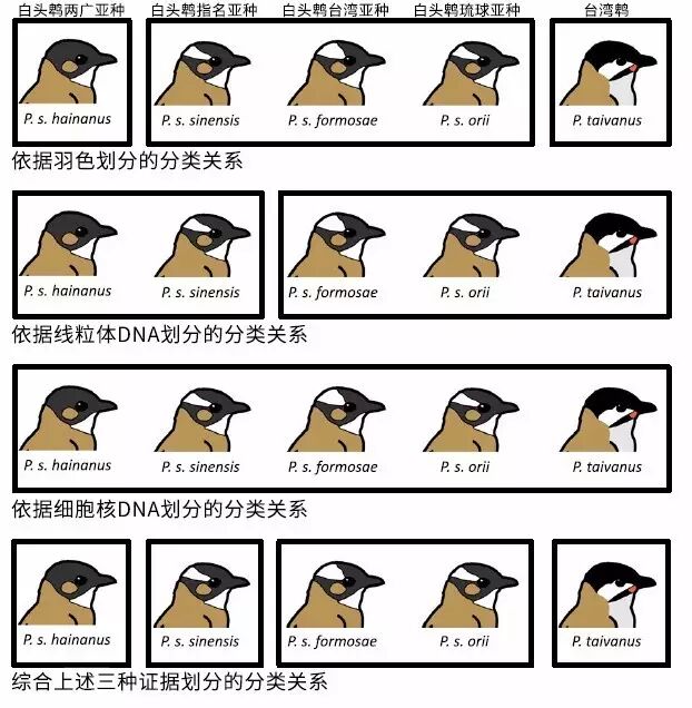 白头鹎有4个亚种,长江流域见到的都是指名亚种(P. s. sinensis),在华南地区分布着两广亚种(P. s. hainanus),在台湾分布着台湾亚种(P. s. formosae),在琉球群岛上还有个琉球亚种(P. s. orii)。其中,两广亚种特别好玩:白头鹎叫这个名字就是因为后脑上有一大簇白色的羽毛,可是两广亚种的头几乎全黑,这在白头鹎4个亚种中是仅有的。外貌有如此大的差异,为啥它们还会被视为同一种鸟?