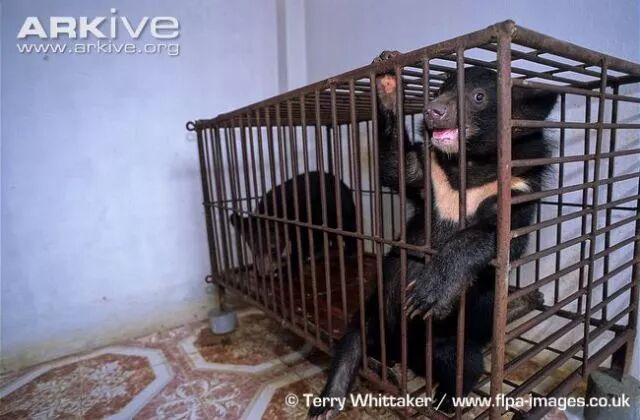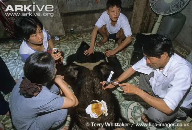 传统医学认为熊胆有护肝利胆的功效,而亚洲黑熊是熊胆生产中最常用的熊科物种。 亚洲黑熊目前面临着与穿山甲类似的命运——国人的需求极大地刺激了东南亚地区的盗猎。从上世纪80年代开始,熊胆需求还催生了“活熊取胆”这种一言难尽的“生产”方式:通过造瘘或者插管引流的方式,从人工饲养的黑熊体内持续获取胆汁。