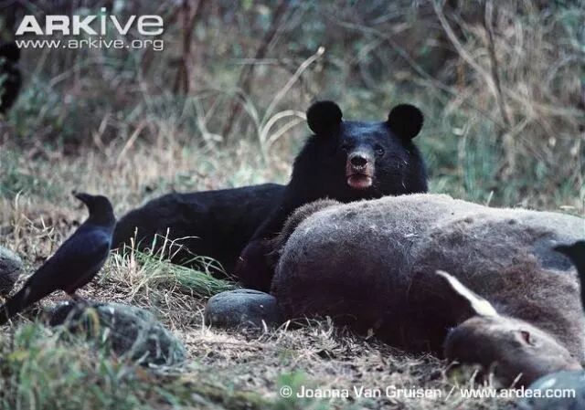 作为“熊瞎子”,视力欠佳的黑熊有着敏锐的嗅觉,图为吃尸体的亚洲黑熊。图片: Joanna Van Gruisen / ardea.com